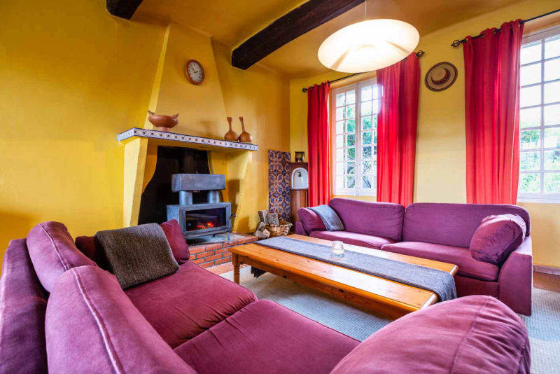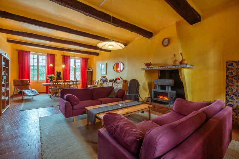 This furnished lounge with wood burning stove, has wi-fi, TV-Vlaanderen, games console, play area for the children, books and magazines.