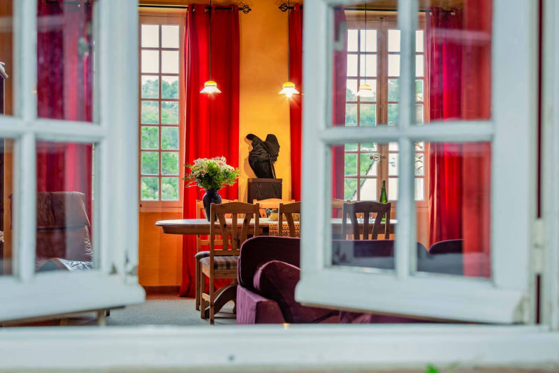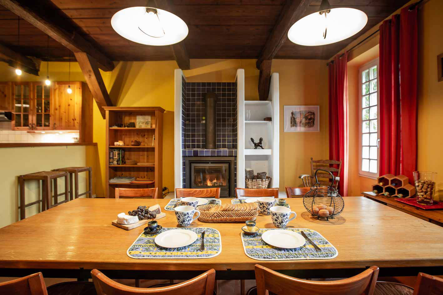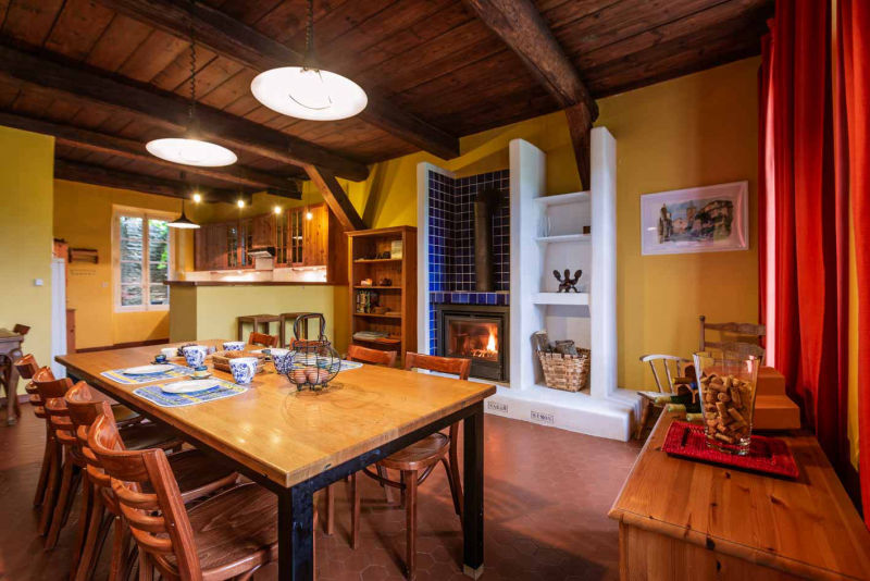 The dining room with wood burning stove creates an unique and cozy atmosphere.